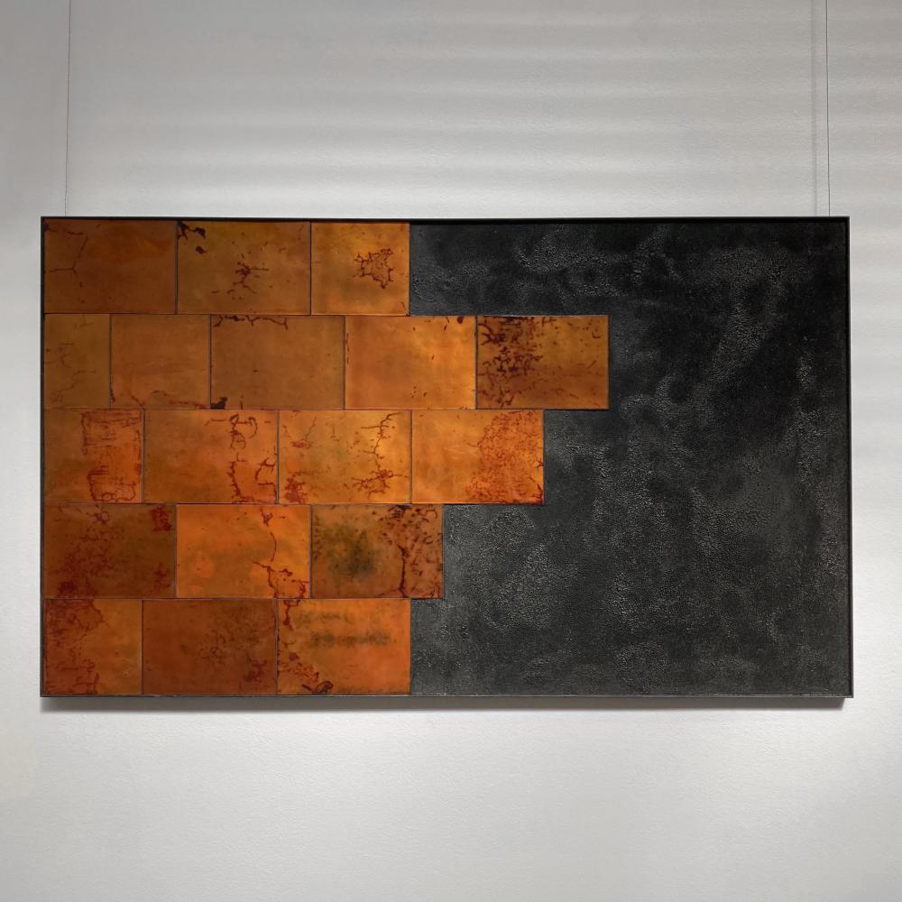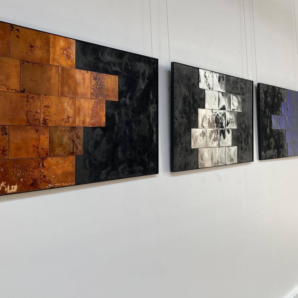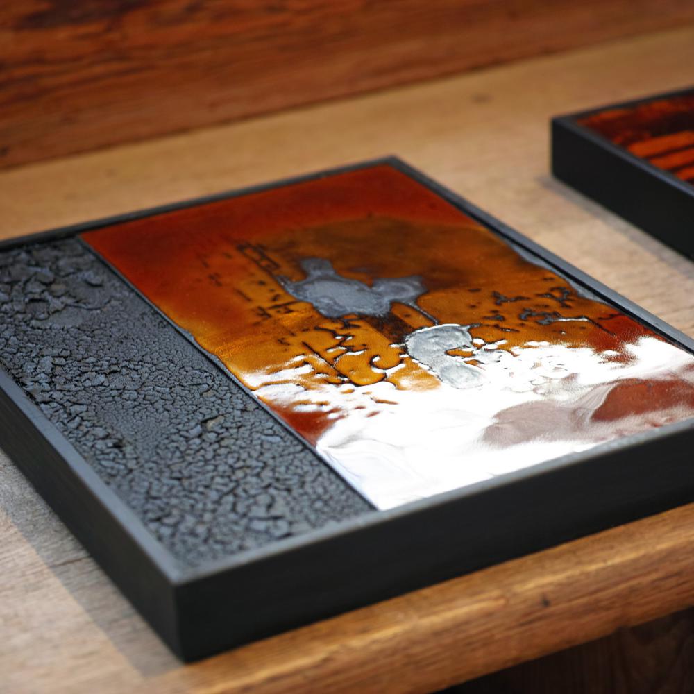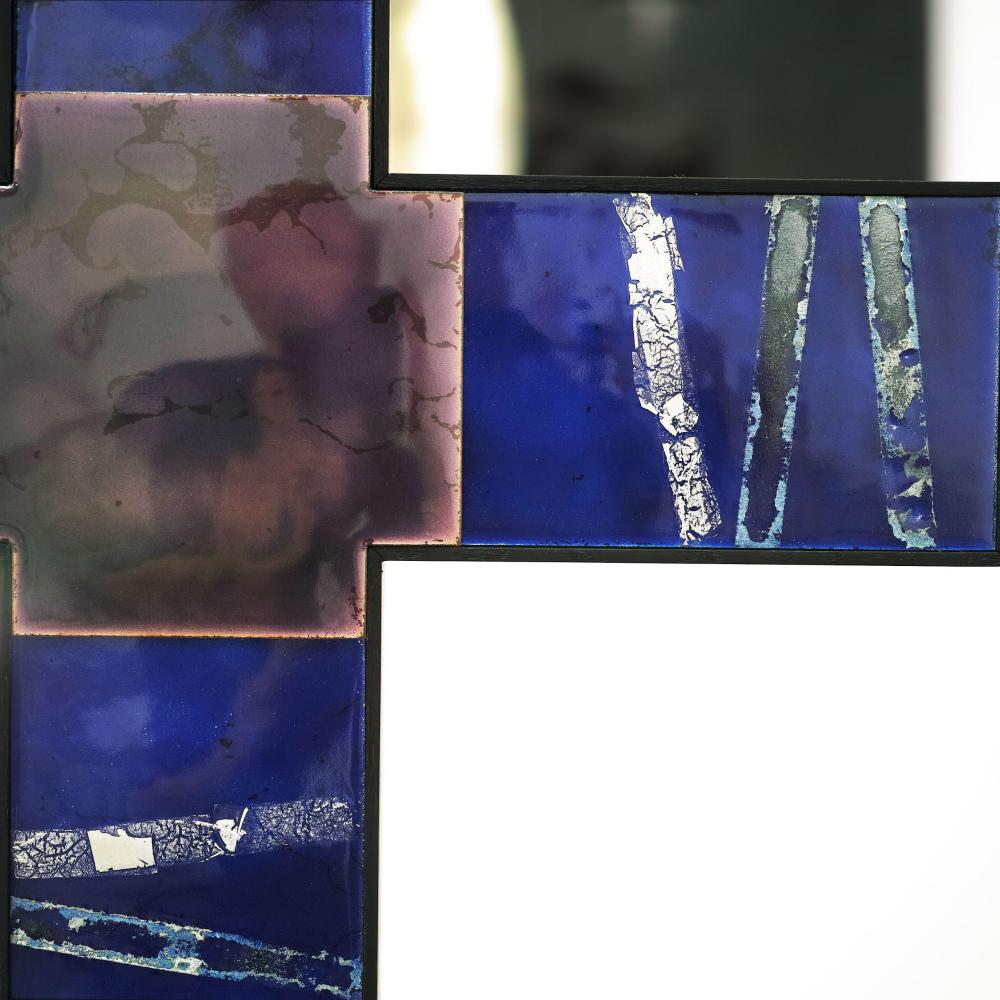 Organisées de manière géométrique, les créations de Christophe Mirande sont plus souvent monochromes, de couleurs rouge, bleu, violet ou encore investies par certain émail jaune d’or. Elles sont sublimées par un mélange de matières hétéroclites telles que l’ardoise, le zinc, le cuivre ou les feuilles d’or permettant de créer une œuvre pleine de contrastes, de luminosité et d’éclat.