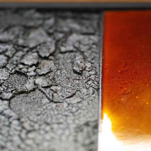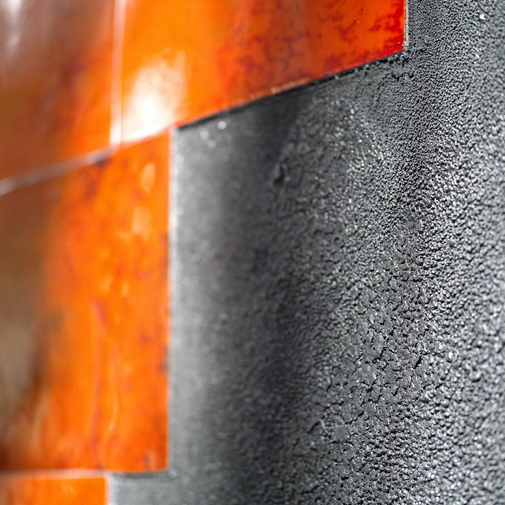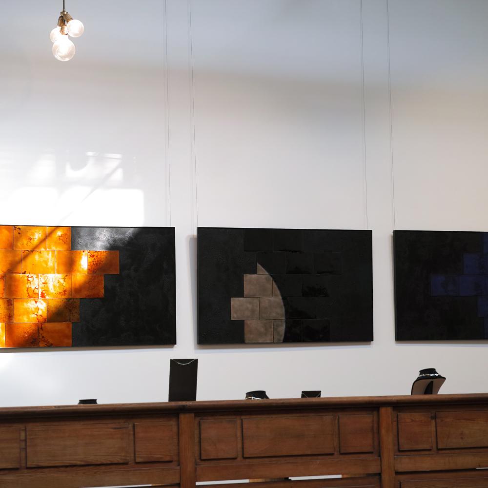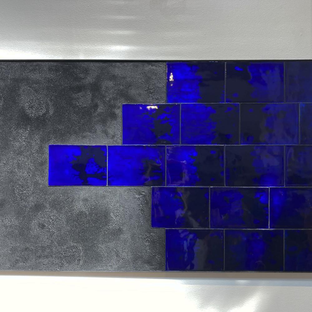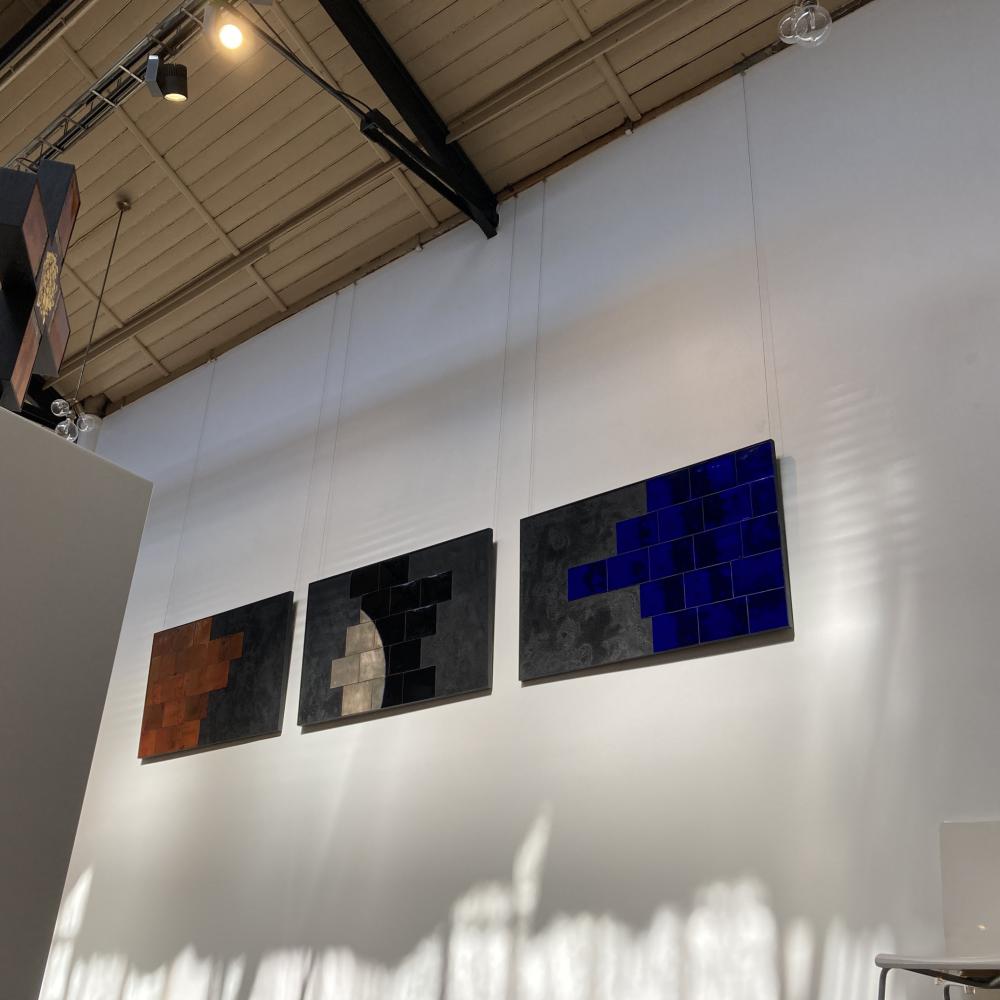 Organisées de manière géométrique, les créations de Christophe Mirande sont plus souvent monochromes, de couleurs rouge, bleu, violet ou encore investies par certain émail jaune d’or. Elles sont sublimées par un mélange de matières hétéroclites telles que l’ardoise, le zinc, le cuivre ou les feuilles d’or permettant de créer une œuvre pleine de contrastes, de luminosité et d’éclat.