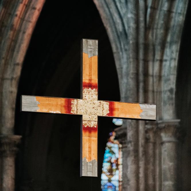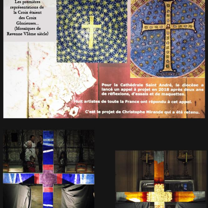 Investir l'espace de la cathédrale St André avec une croix de 1,80x1,80m, en élévation dans l'espace, au dessus de l'autel... Oser prendre sa place dans un lieu qui a vu le mariage de Louis XIII et Anne d'Autriche, d'Aliénor d'Aquitaine et du futur Louis VII... Un sacré défi.