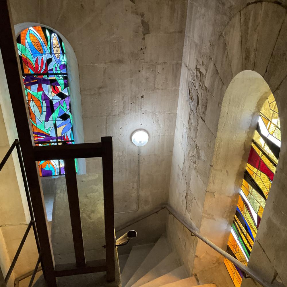Ce choix d’employer des verres bruts teintés dans la masse, totalement dépourvus de la moindre peinture comme cela est couramment pratiqué, donne une intensité et une présence particulière à l’ensemble des vitraux de cette église.