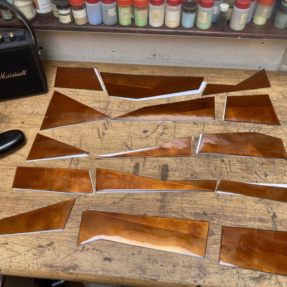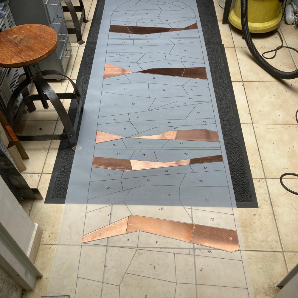 A ma connaissance l’inclusion d’émaux sur cuivre dans un vitrail n’a jamais été réalisée auparavant.