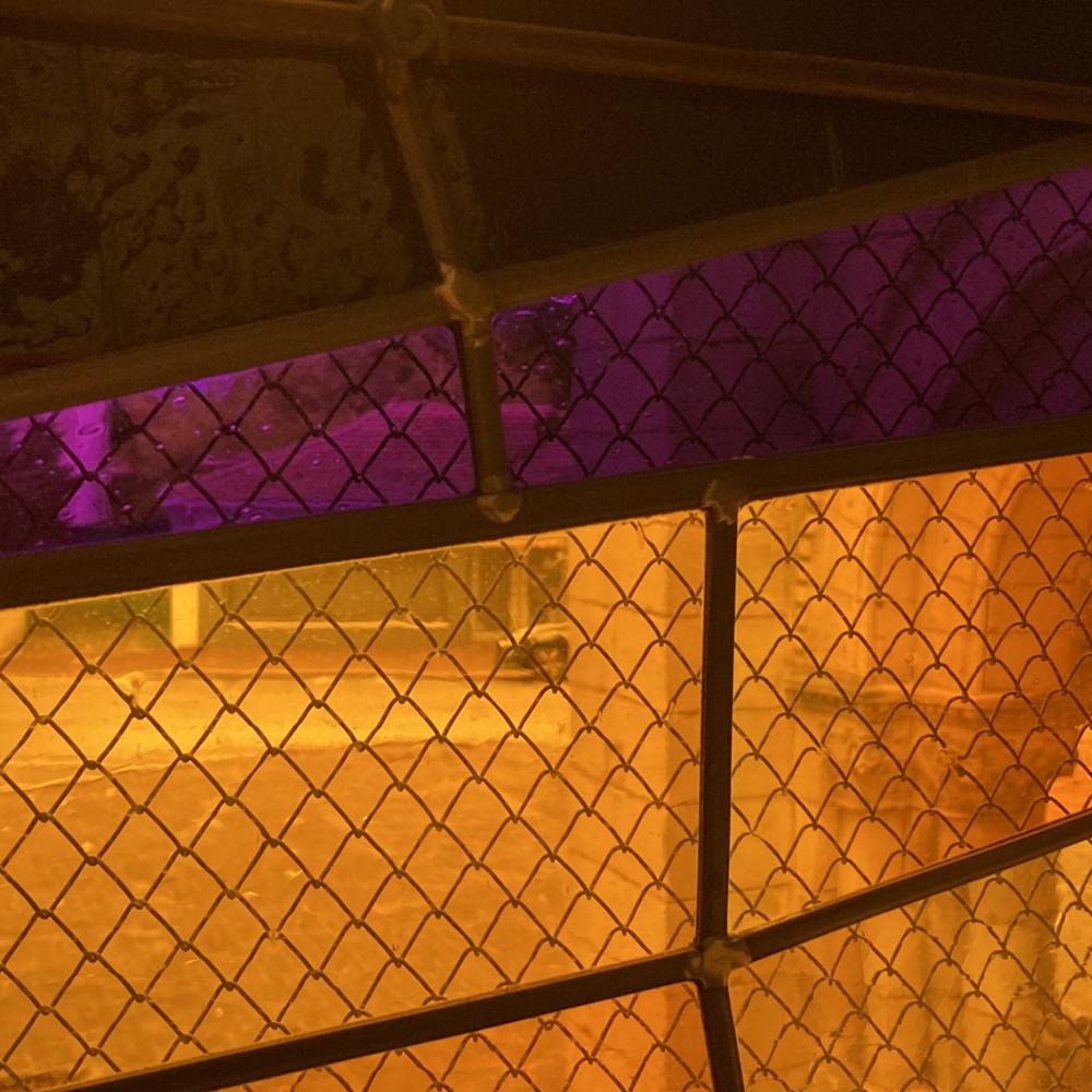 Le vitrail que j’ai créé, Feu originel, est donc avant tout composé de teintes, nuances et dégradés issus du feu. Cette intensité monochrome jaune/orangée vise à donner au spectateur la sensation que le feu est à l’intérieur de l’église. En pleine journée, lorsque la lumière du jour est là, il n’est que braises, et couve doucement, attendant son heure. Lorsque la nuit apparaît, les éclairages artificiels révèlent alors une explosion de lumières puissantes et chaudes.