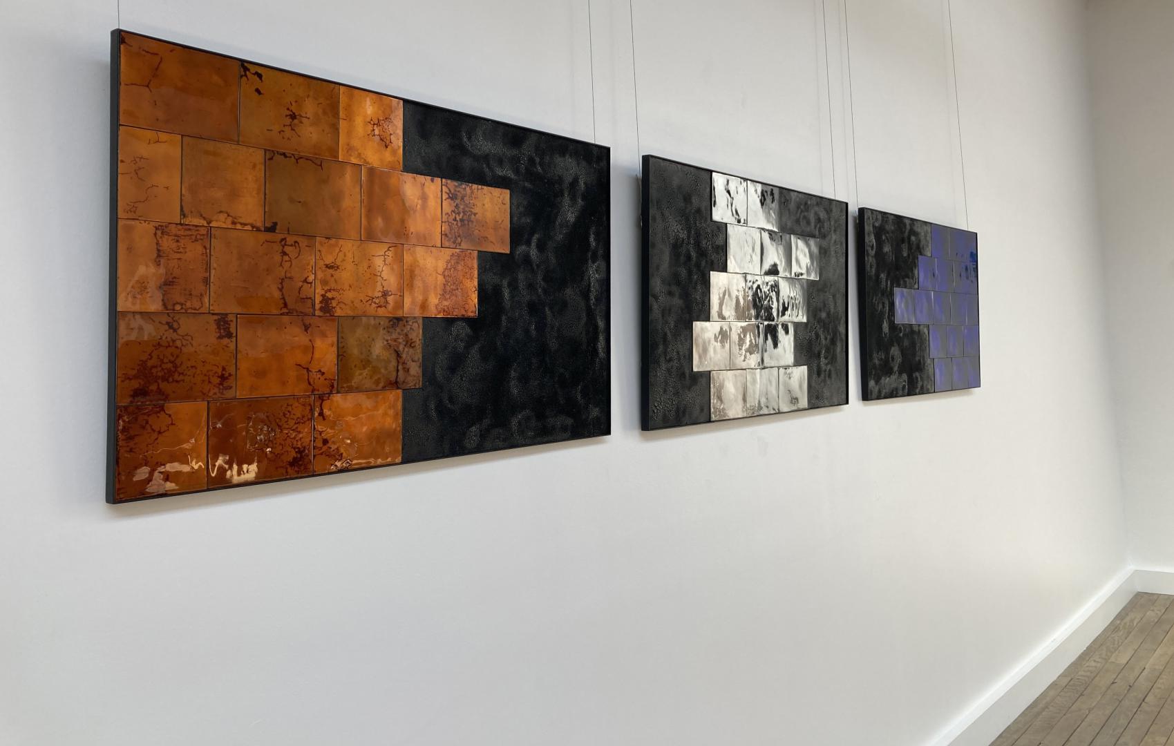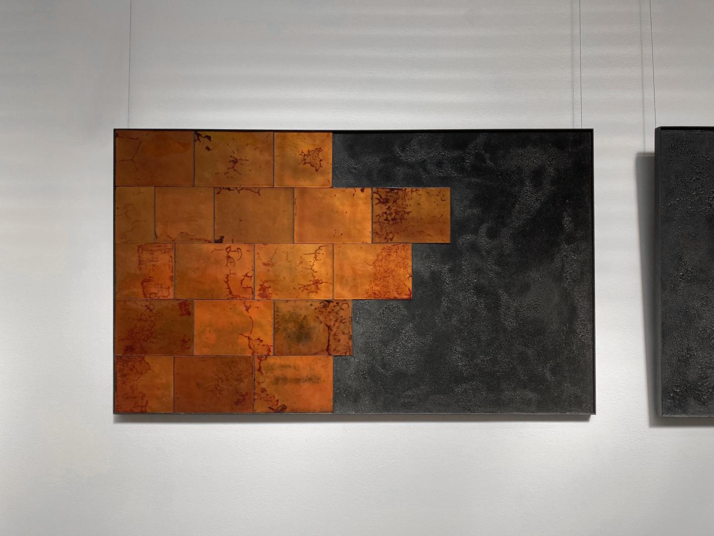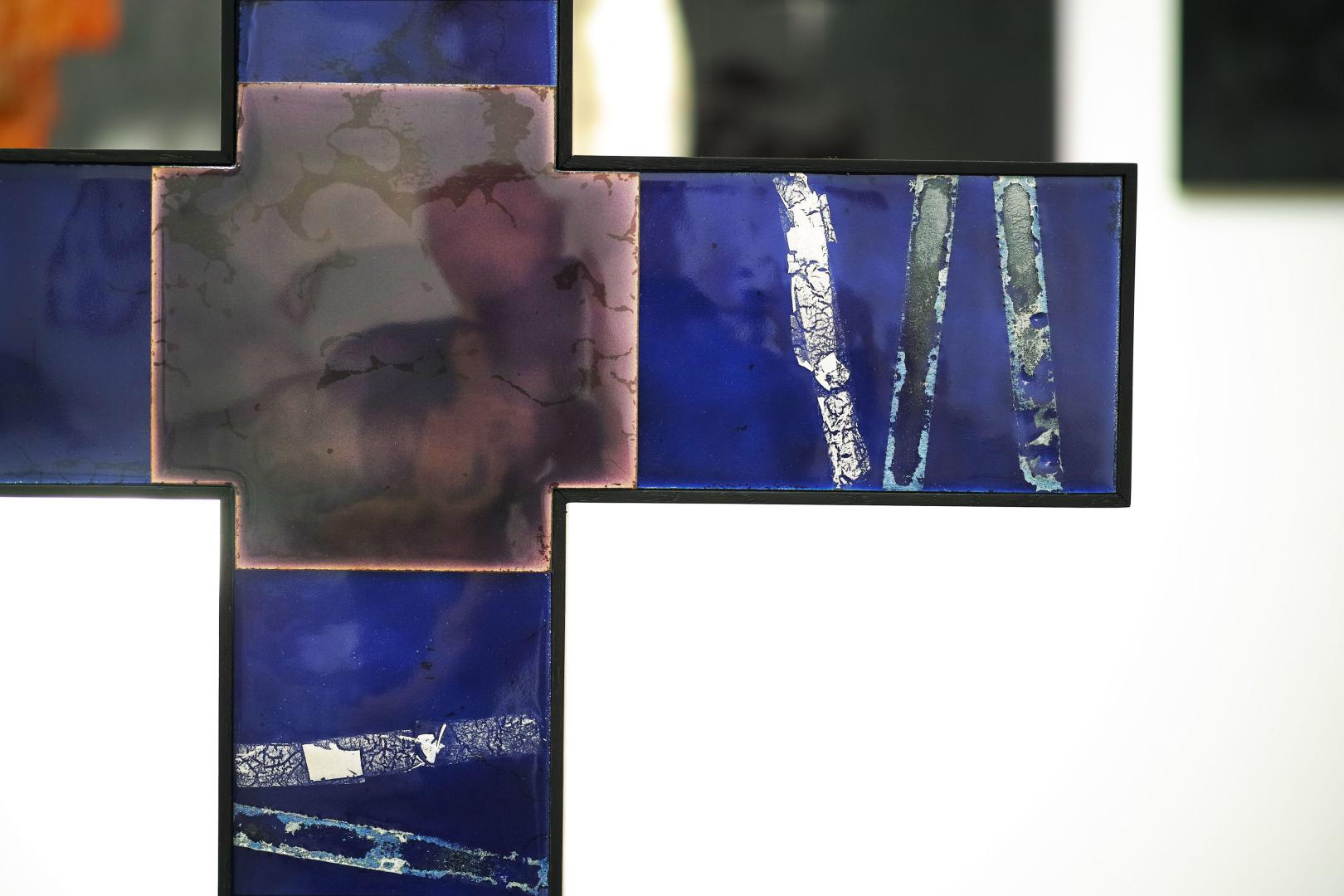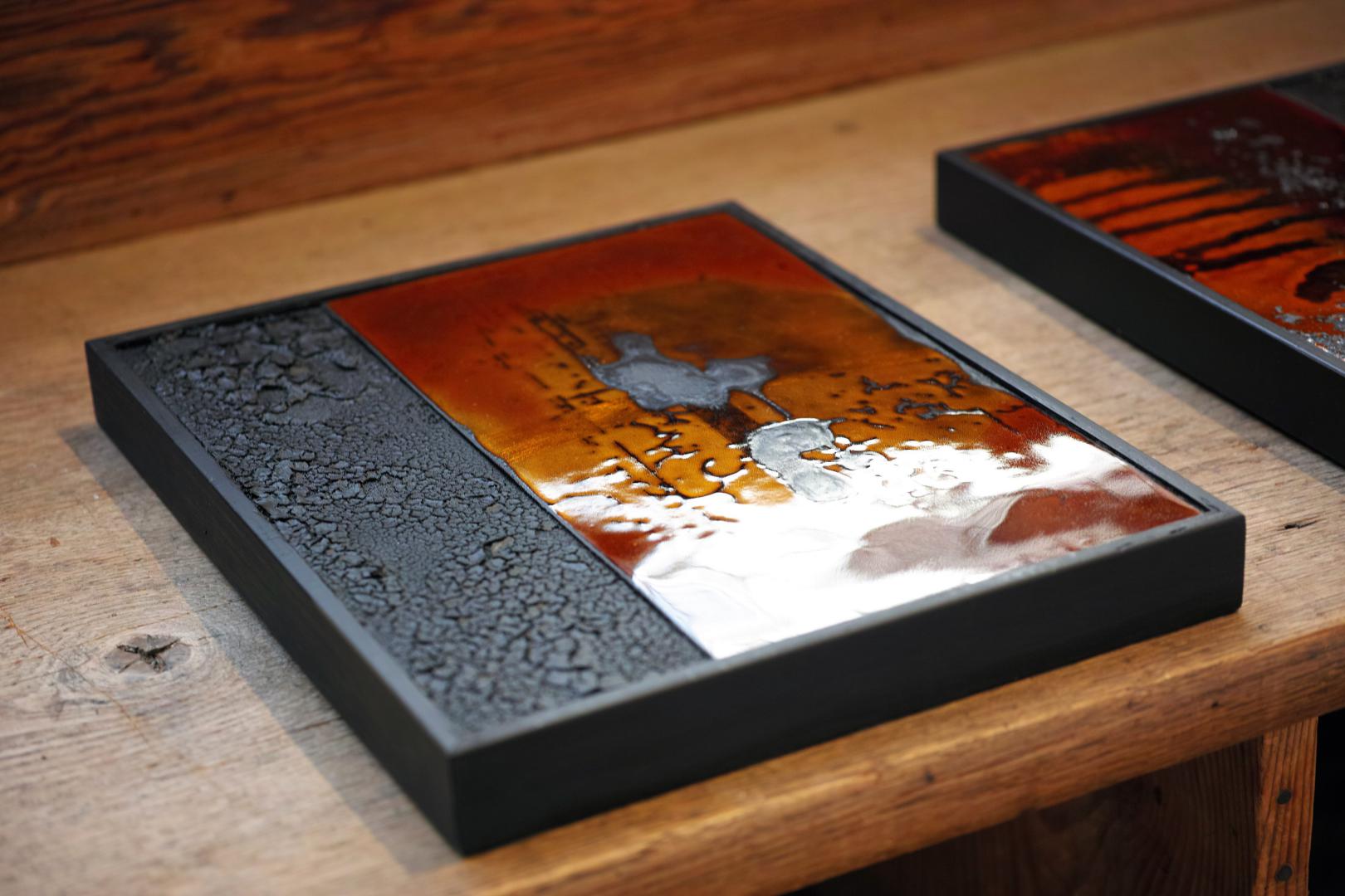Organisées de manière géométrique, les créations de Christophe Mirande sont plus souvent monochromes, de couleurs rouge, bleu, violet ou encore investies par certain émail jaune d’or. Elles sont sublimées par un mélange de matières hétéroclites telles que l’ardoise, le zinc, le cuivre ou les feuilles d’or permettant de créer une œuvre pleine de contrastes, de luminosité et d’éclat.