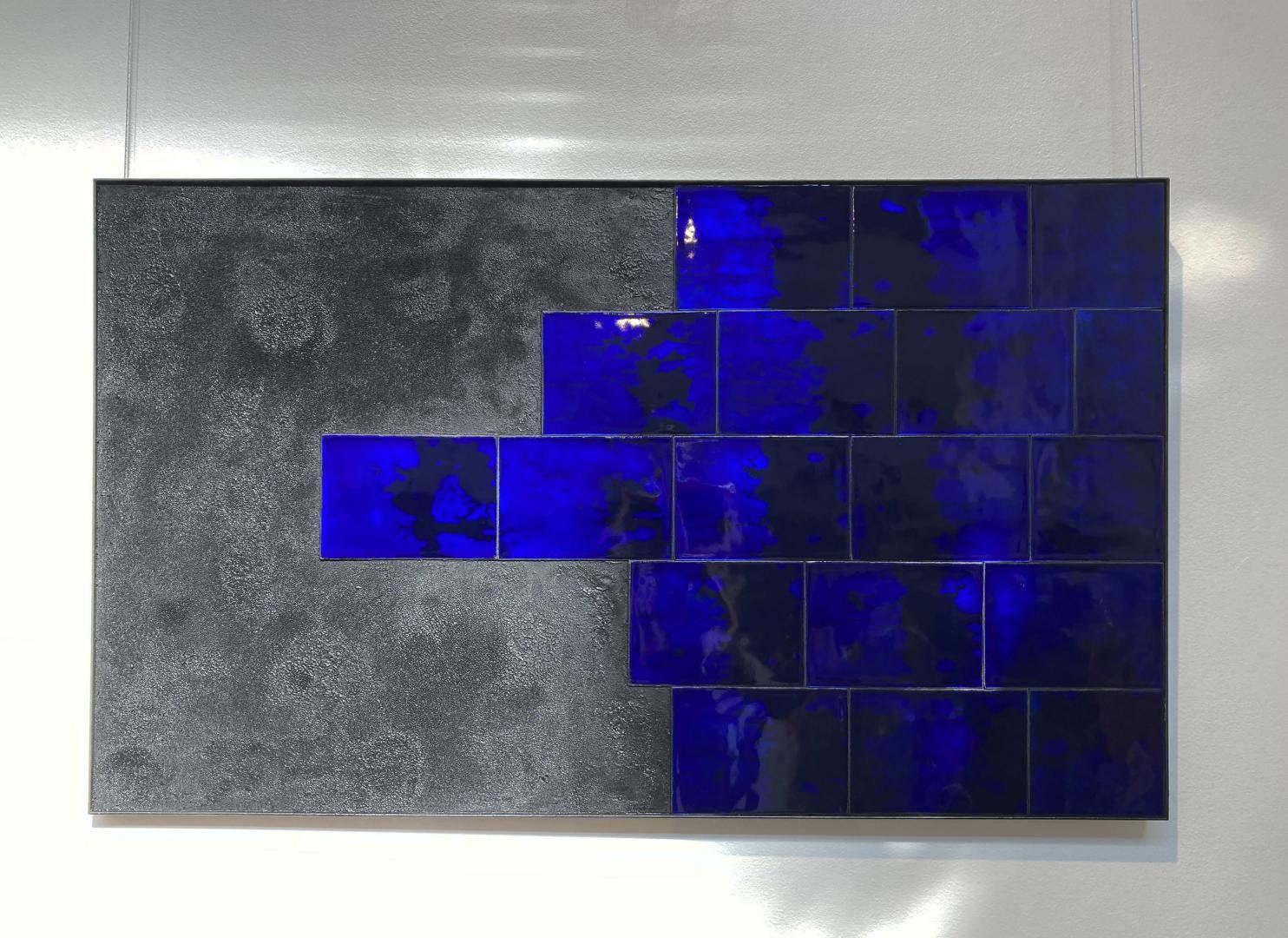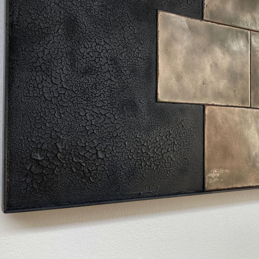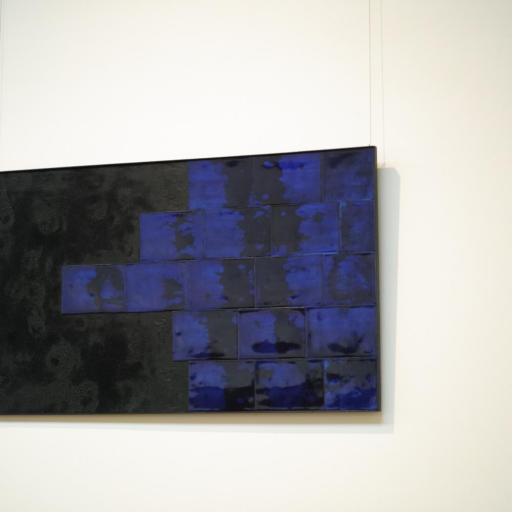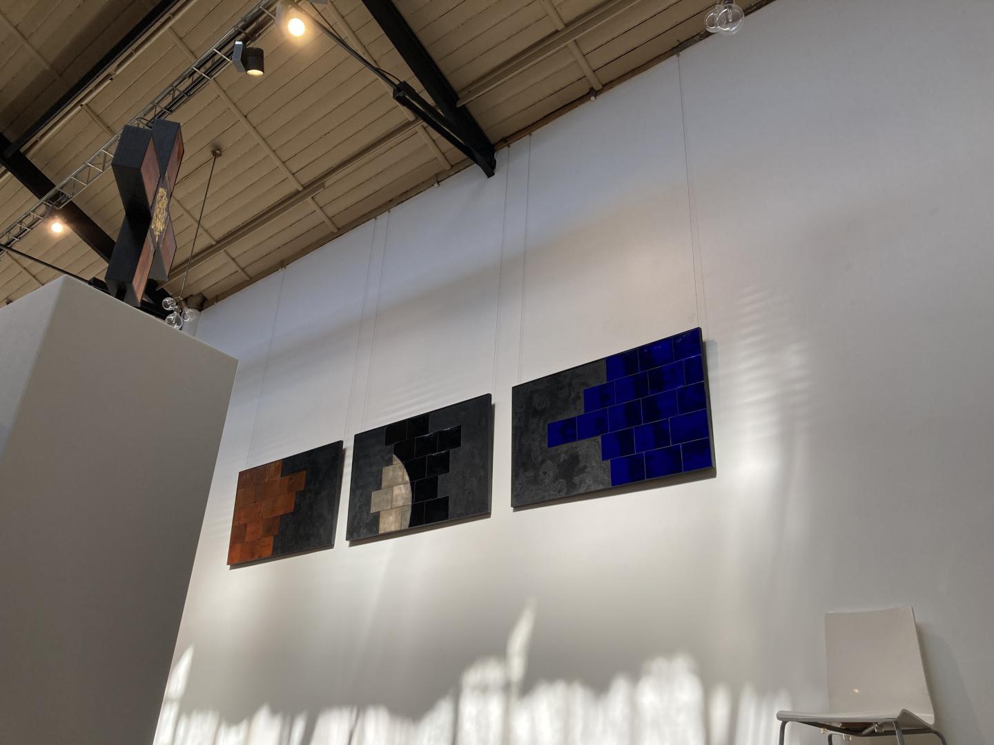 Organisées de manière géométrique, les créations de Christophe Mirande sont plus souvent monochromes, de couleurs rouge, bleu, violet ou encore investies par certain émail jaune d’or. Elles sont sublimées par un mélange de matières hétéroclites telles que l’ardoise, le zinc, le cuivre ou les feuilles d’or permettant de créer une œuvre pleine de contrastes, de luminosité et d’éclat.