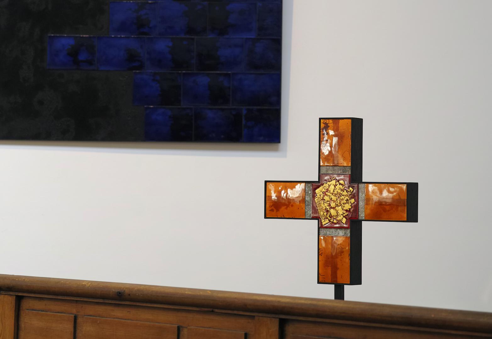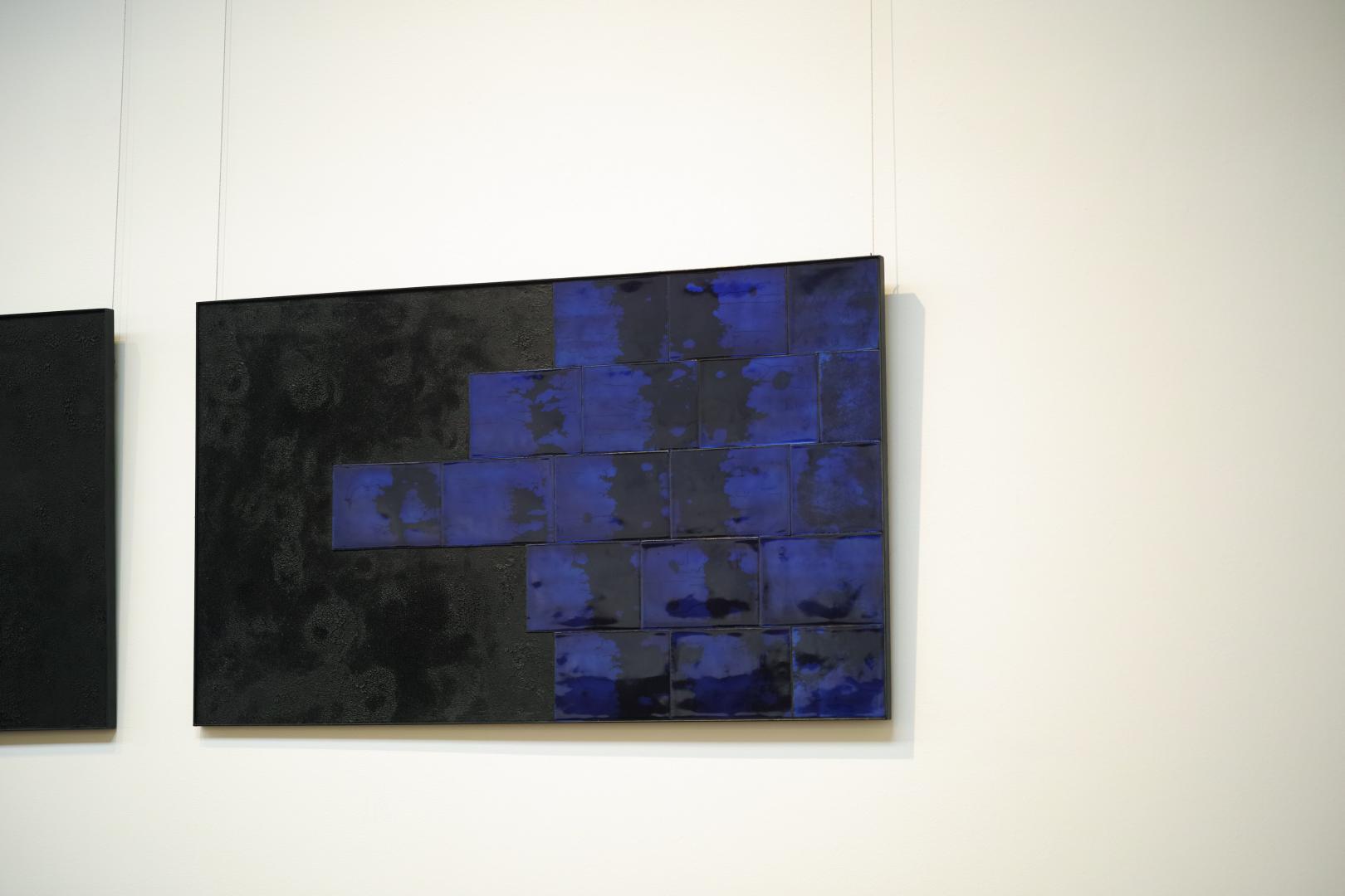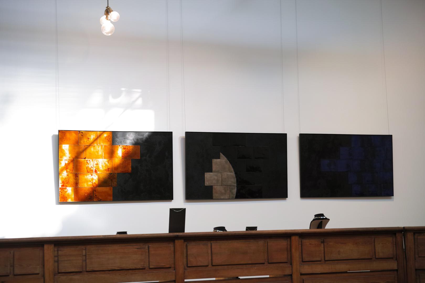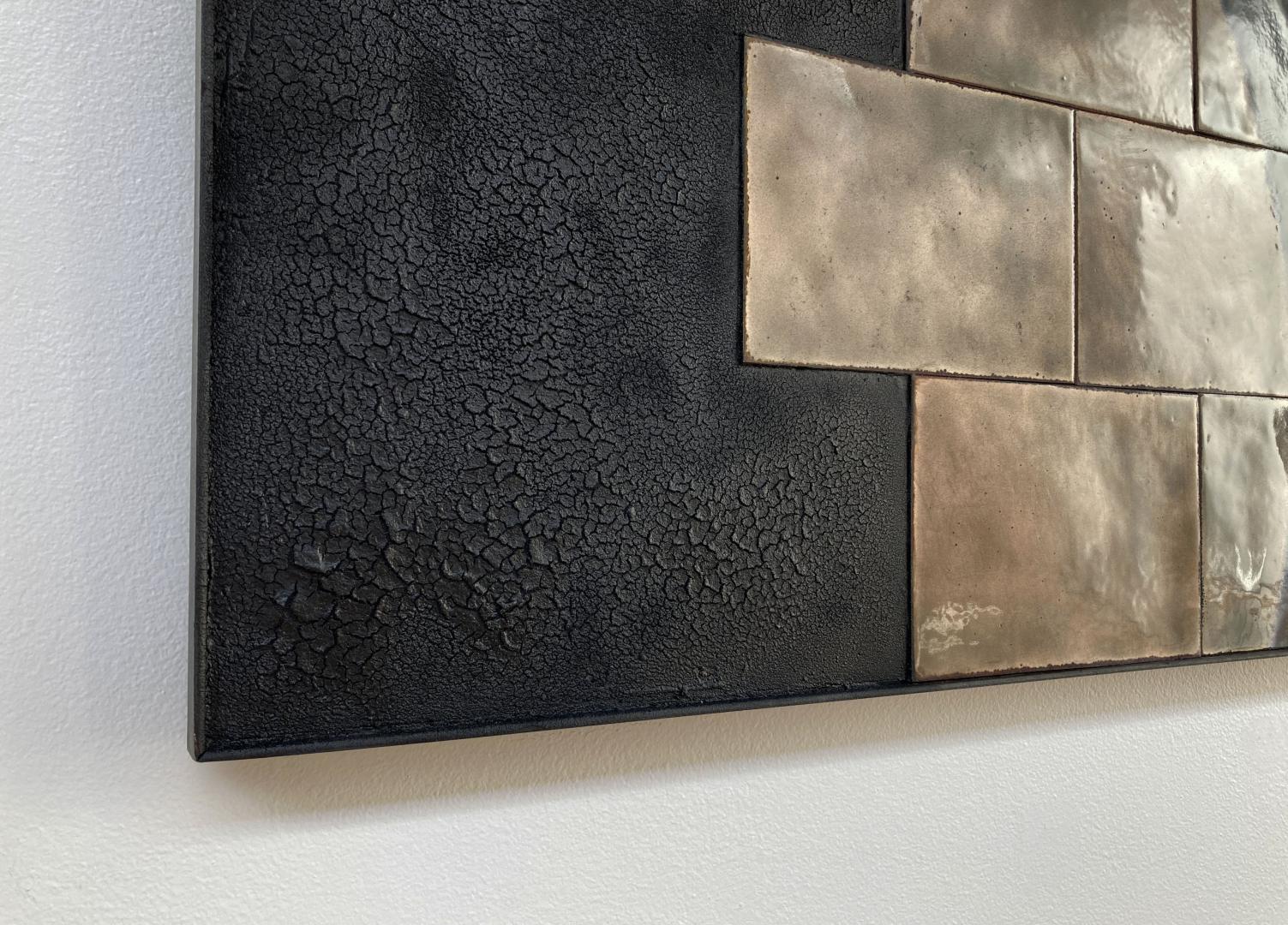Organisées de manière géométrique, les créations de Christophe Mirande sont plus souvent monochromes, de couleurs rouge, bleu, violet ou encore investies par certain émail jaune d’or. Elles sont sublimées par un mélange de matières hétéroclites telles que l’ardoise, le zinc, le cuivre ou les feuilles d’or permettant de créer une œuvre pleine de contrastes, de luminosité et d’éclat.