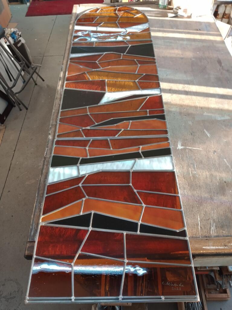 Le fait d’inclure des plaques de cuivre émaillées dans ce vitrail est pour moi source d’une double satisfaction ; la satisfaction de l’artiste plasticien qui aime avant tout concevoir, sans limite de savoir-faire, les projets qui lui passent par la tête, et la satisfaction de l’artisan qui aime également travailler ses matières de prédilection et les utiliser dans ses propres créations.