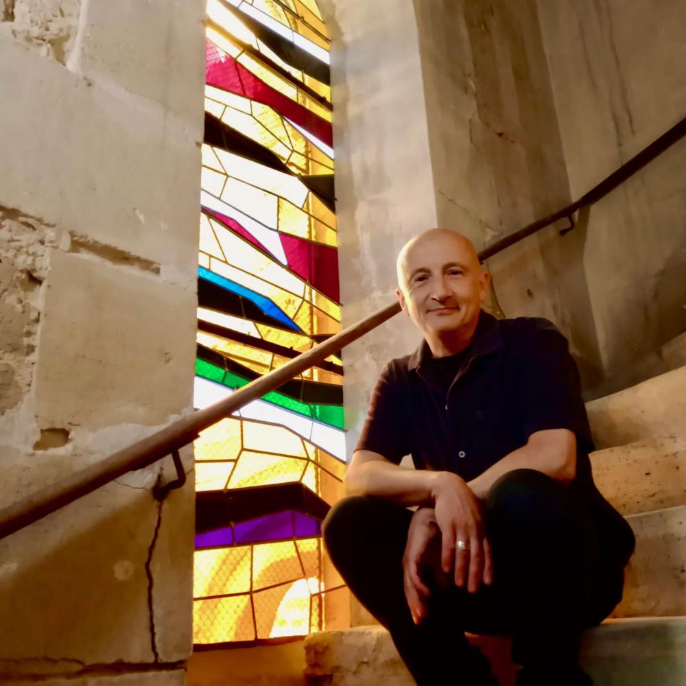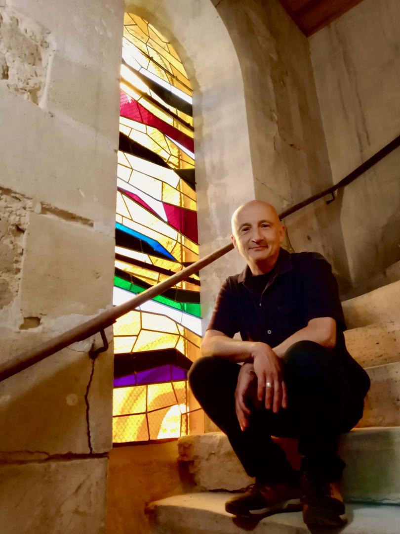 A travers ce projet de vitrail, l’enjeu, périlleux pour moi, était d’établir un lien avec le travail de mon père, tout en proposant une œuvre vitraillée qui soit en résonance avec mon propre univers artistique.