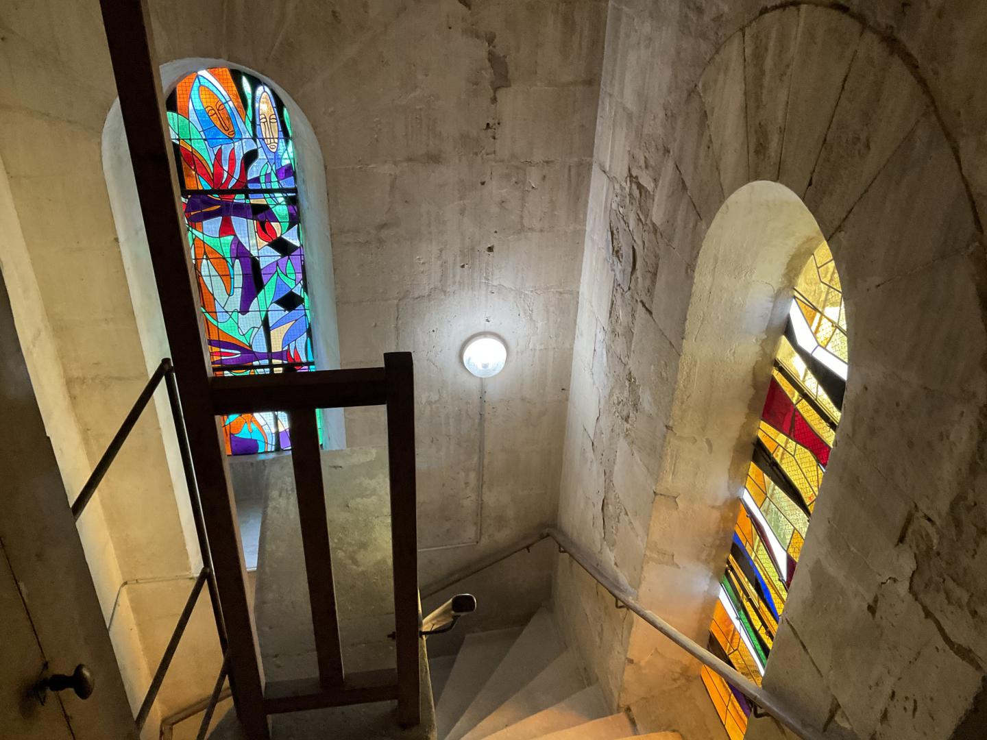 Ce choix d’employer des verres bruts teintés dans la masse, totalement dépourvus de la moindre peinture comme cela est couramment pratiqué, donne une intensité et une présence particulière à l’ensemble des vitraux de cette église.