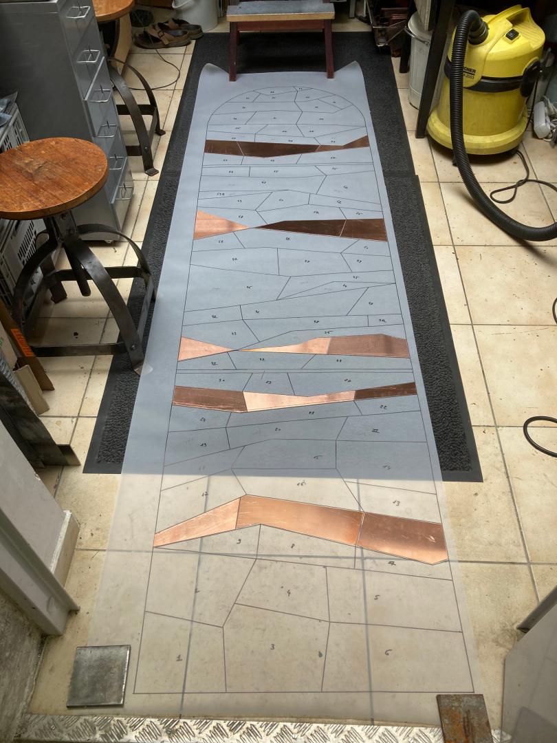 A ma connaissance l’inclusion d’émaux sur cuivre dans un vitrail n’a jamais été réalisée auparavant.