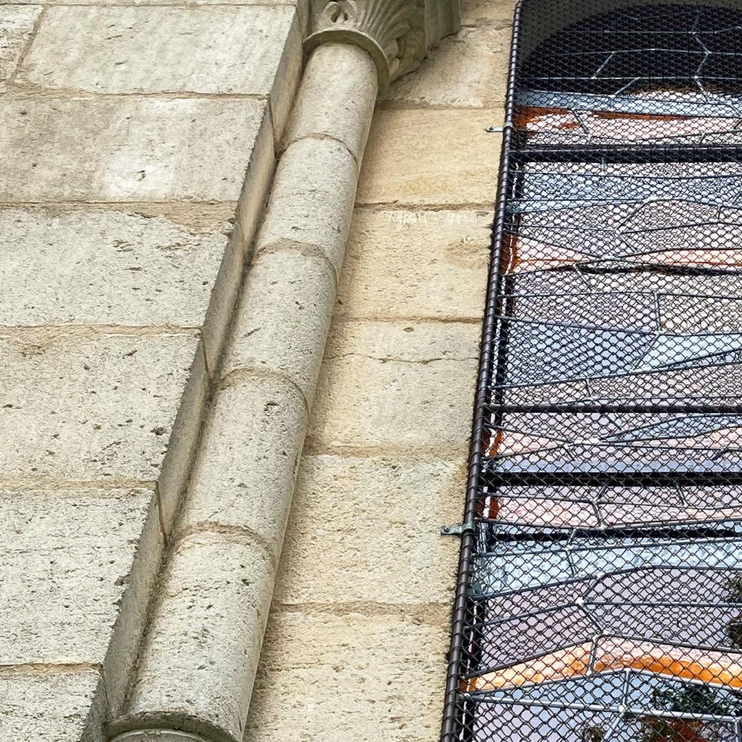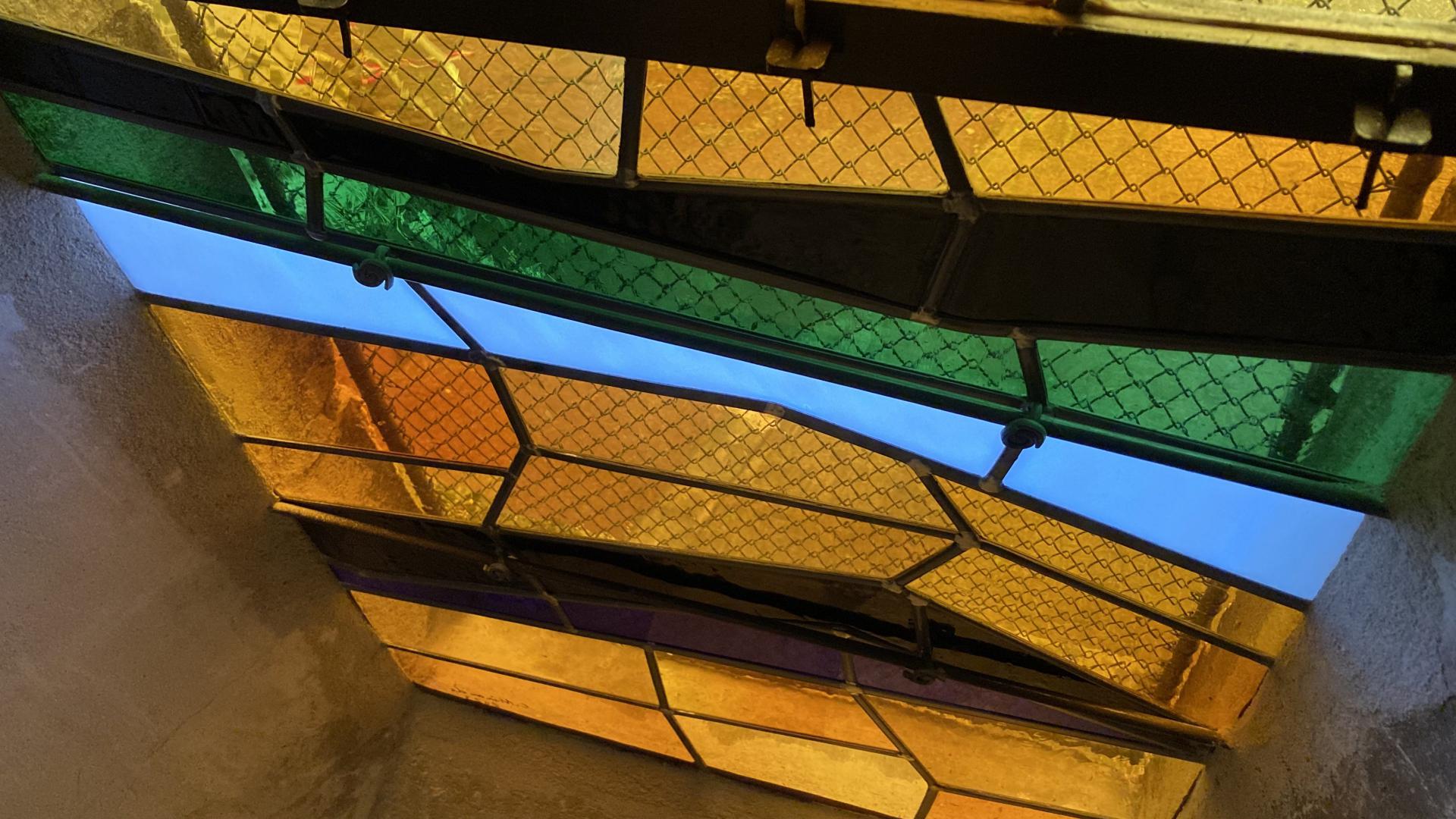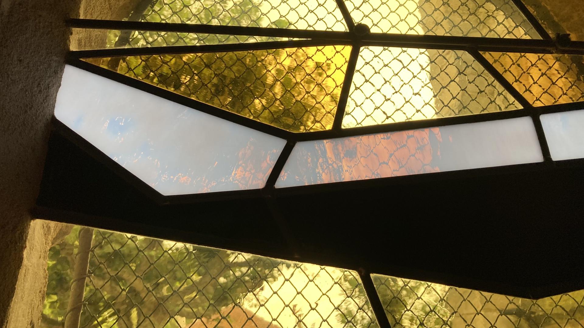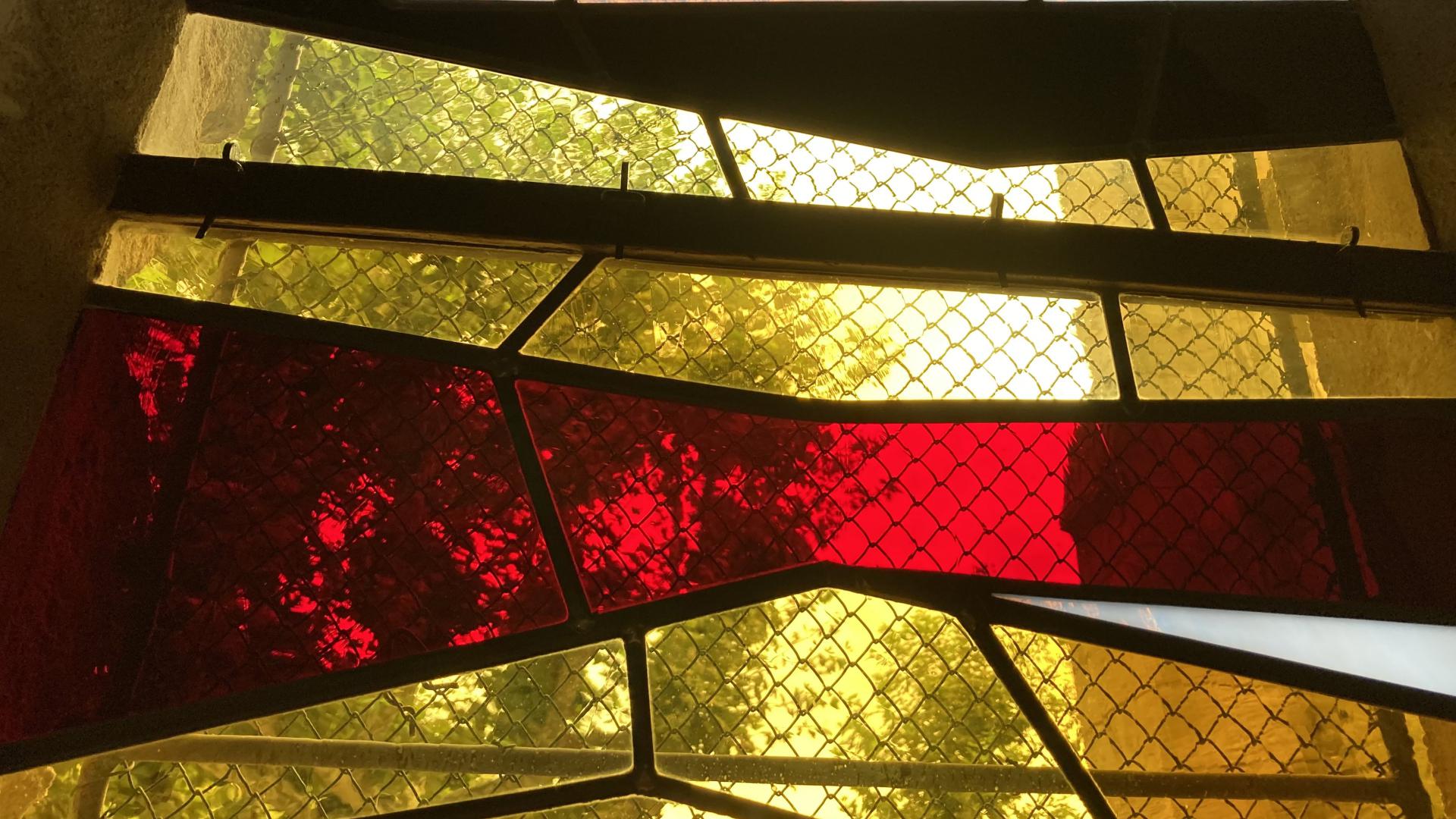 En parfaite continuité cette fois avec les vitraux plus anciens présents dans l’église, j’ai choisi d’utiliser des verres soufflés et colorés dans la masse, porteurs de disparités et bulles naturelles liées à la fabrication, ce qui au final les rendent individuellement tous uniques. Ces verres soufflés jouent ainsi avec la lumière en harmonie avec les vitraux adjacents.