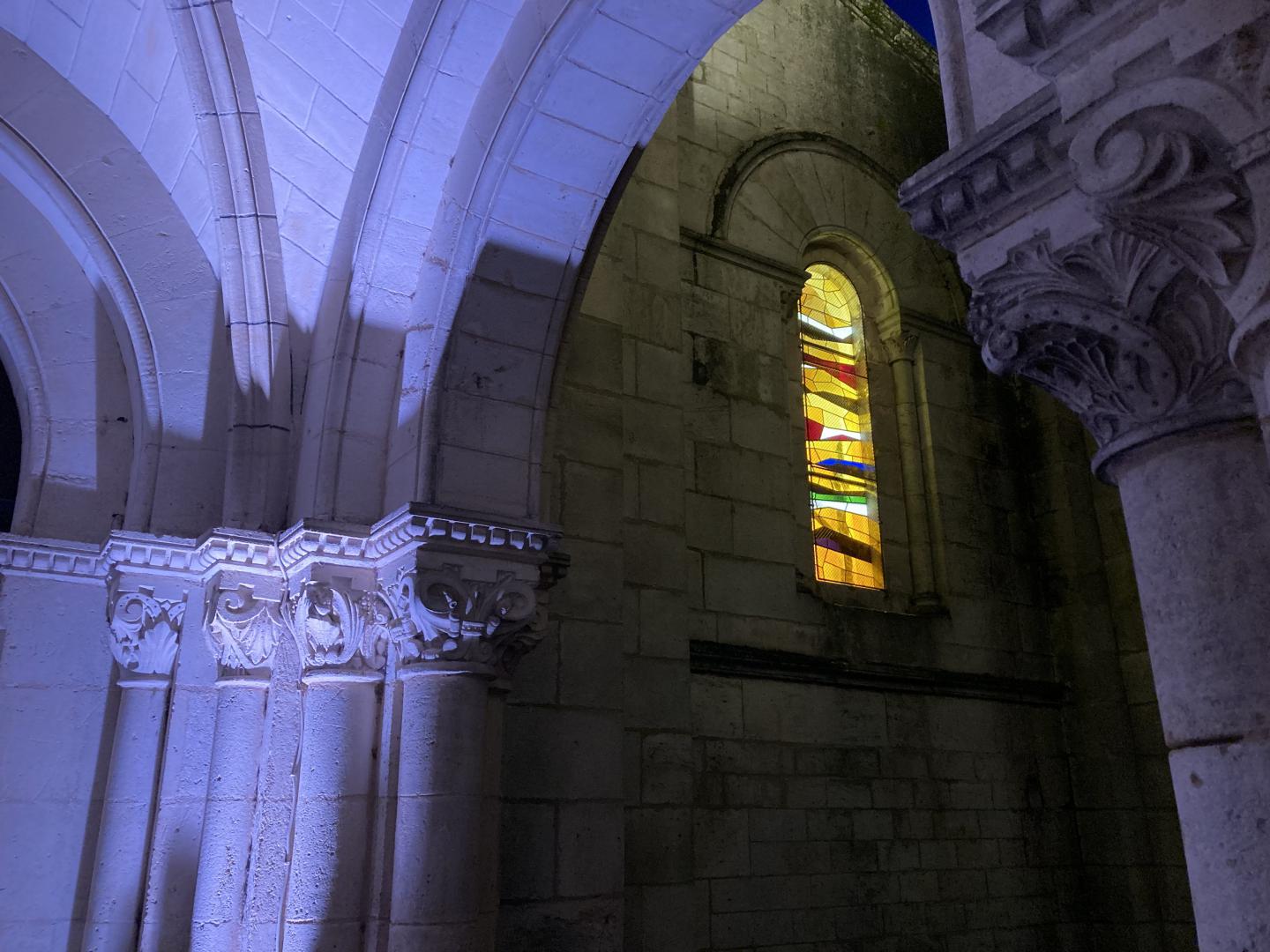 Au final, les deux verrières sombres n’existent plus ; deux créations ont pris place avec bonheur. Cette église est devenue une véritable sculpture de lumière, de couleur et de feu, offerte aux yeux de tous dès la nuit tombée, et j’en suis profondément heureux.